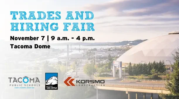 Join Korsmo Construction and Tacoma Public Schools for the annual Trades & Hiring Fair on November 7th from 9am-4pm at the Tacoma Dome. This free event is open to all students and community members throughout the South Puget Sound. Attendees will have the opportunity to talk with industry professionals about their line of work while participating in hands-on activities and live demonstrations. There will be approximately 100 booths from local trades-related companies, educational institutions, and apprenticeship programs, offering career exploration and job opportunities for youth and adults alike. If your organization is interested in participating as a vendor please sign up using the QR code or going to the registration platform here.