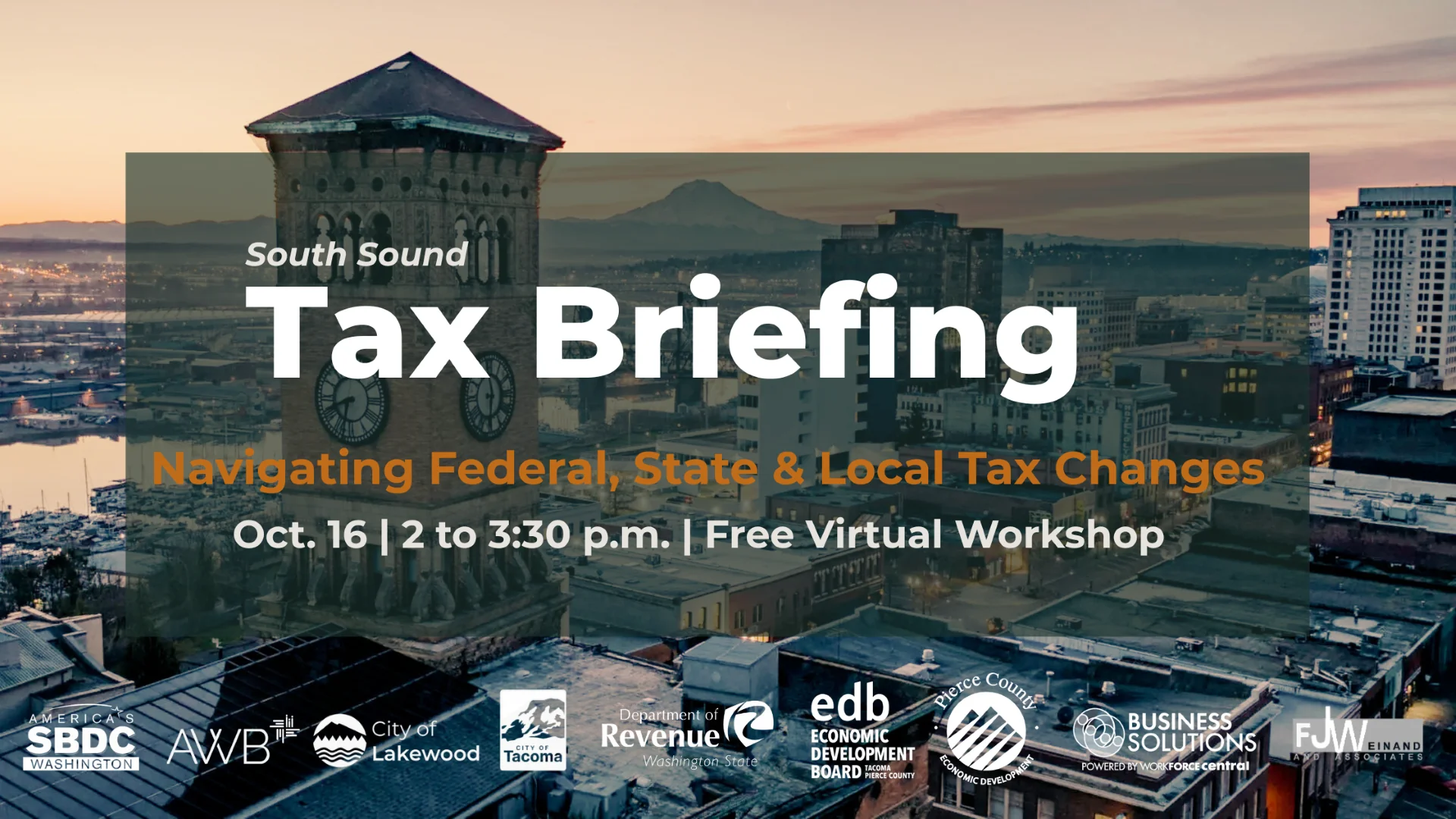 Webinar Description: South Sound businesses are invited to join us for a free virtual webinar on navigating upcoming federal, state, and local tax changes. Presented in partnership with the Association of Washington Business, City of Lakewood, City of Tacoma, Economic Development Board for Tacoma-Pierce County, Pierce County Economic Development, Washington Department of Revenue, Washington Small Business Development Center, Weinand & Associates, and WorkForce Central, this session will provide strategies, resources, and perspectives tailored for businesses in our region.