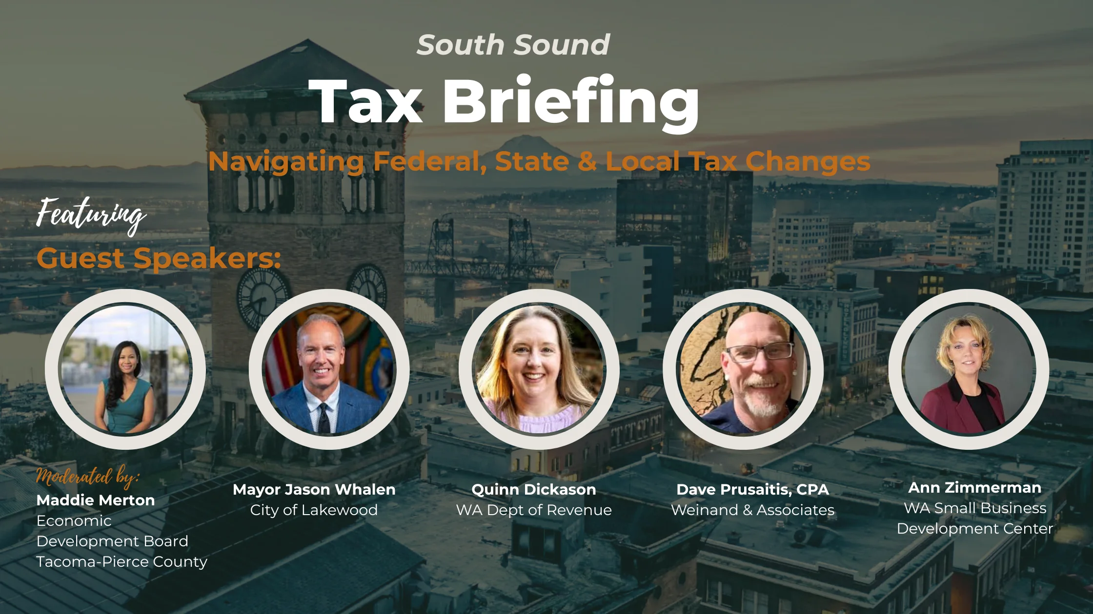 Held in partnership with the Association of Washington Business, City of Lakewood, City of Tacoma, Pierce County Economic Development, the Washington Small Business Development Center (SBDC), the Washington State Department of Revenue (DOR), Weinand & Associates, and WorkForce Central, the virtual event brought together business owners, accountants, and policymakers to prepare for the year ahead.
